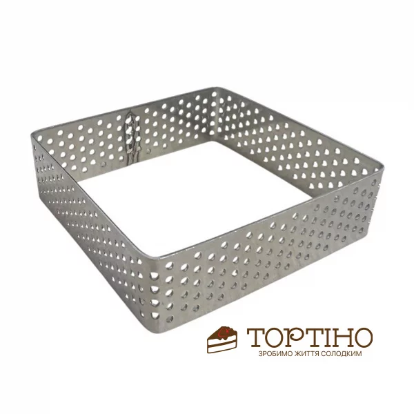 Форма для випічки перфорована Квадрат з нержавіючої сталі для випічки виробів з пісочного тіста (тартів, кішів, пирогів, галет). Випечені за допомогою цієї металевої форми вироби готуватимуться швидше, а пропікатися краще. Випічка буде виходити рівна і красива, вийматися легко і не розкришиться – бо перфорація забезпечує циркуляцію повітря і видаляє зайву вологу при випічці. Зменшує ризик підгорання виробу і забезпечує його однорідну випічку з усіх боків.