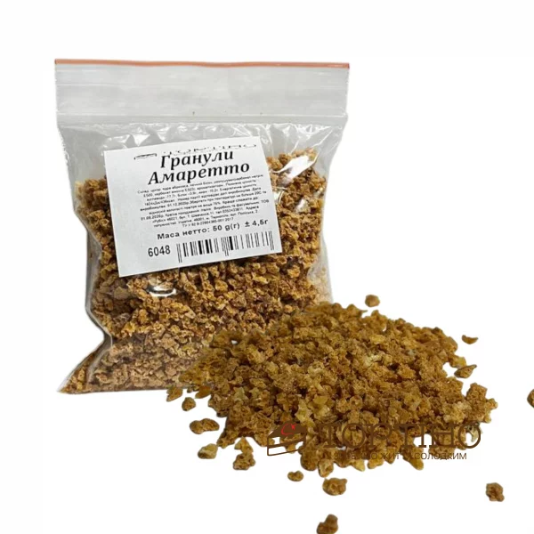 Гранули «Амаретто» - це універсальна суха бісквітна посипання карамельного кольору у вигляді гранул зі смаком мигдальної гіркуватості.