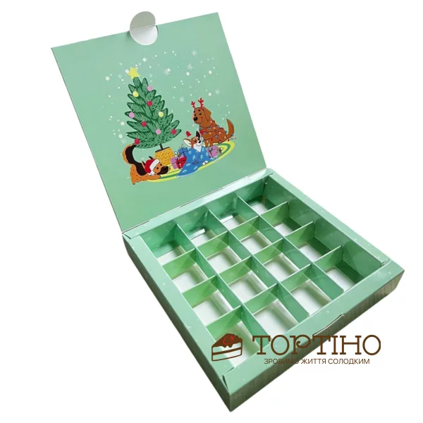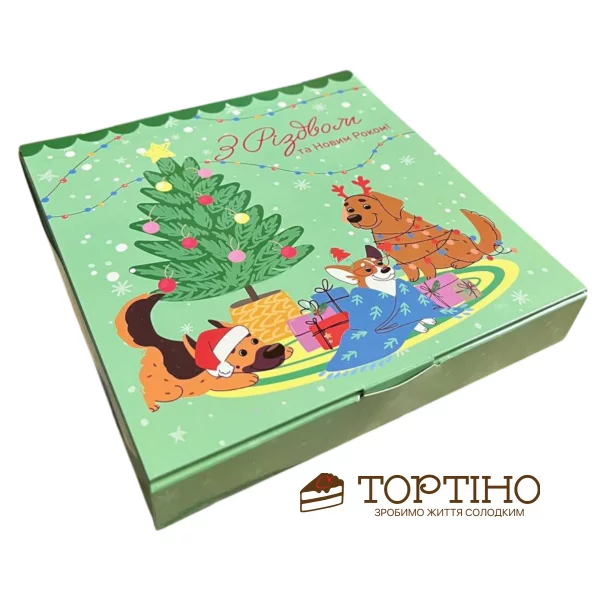 Головна - Пакувальні матеріали - Картонна упаковка - Коробка для пряників і цукерок - Коробка для цукерок Новорічні песики, 18,5*18,5*3 см