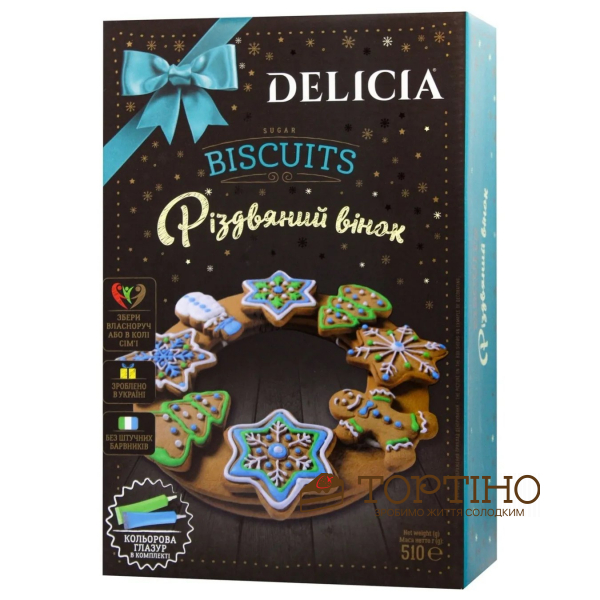 Набір новорічного цукрового печива Delicia Різдвяний вінок – це чарівний набір печива у формі різдвяного вінка, що створює святковий настрій, ідеальний для новорічних свят чи сімейного чаювання.