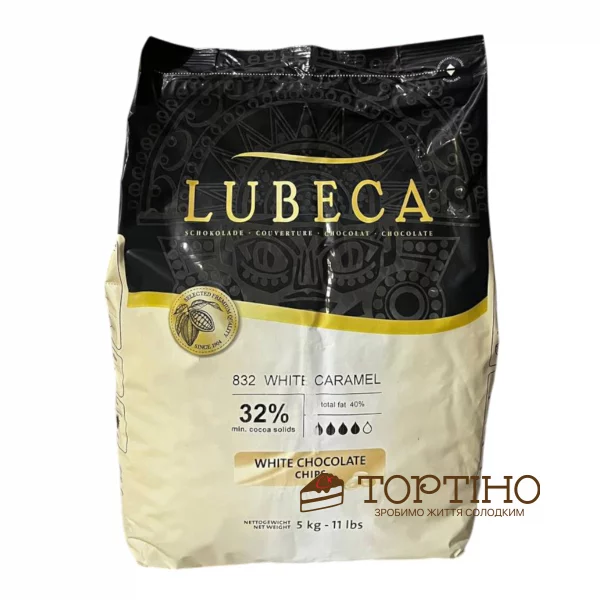Білий шоколад Lubeca 32% зі смаком карамелі — це вишуканий преміальний шоколад із глибокими нотами карамелізованого цукру, вершків та легкою солонуватою солодкістю.
