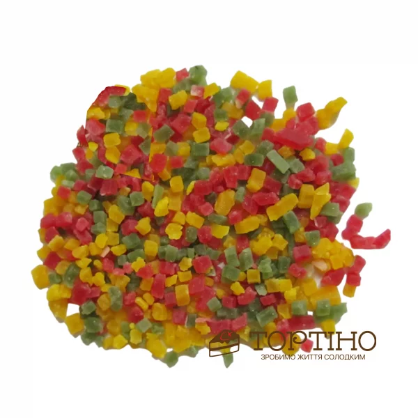 Продукт на натуральной фруктово-ягодной основе в виде кубиков размером около 5 мм 5 мм 5 мм, пересыпанных крахмалом для предотвращения их слипанию. Продукт термостабильный. Благодаря этому успешно используется при производстве кексов. Вносится в тесто перед выпечкой.