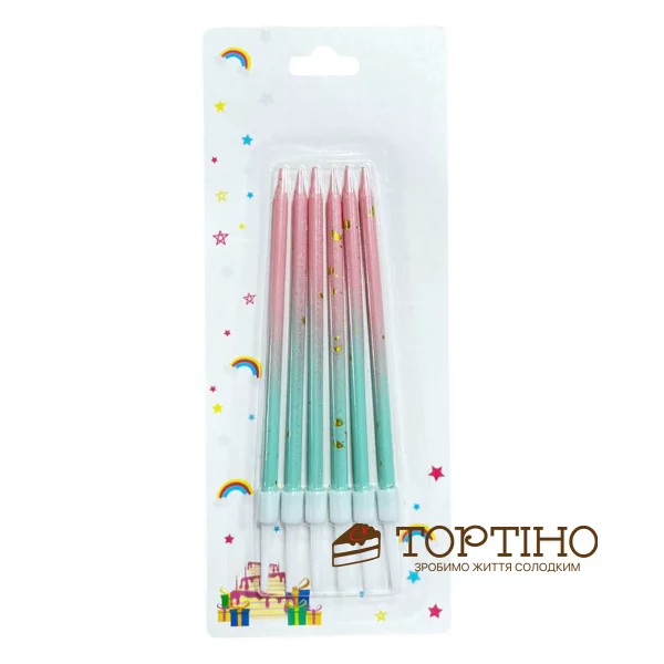Головна - Все для свята - Свічки, серветки, дитячий посуд - Свічки святкові - Свічки Кольорові - Свічки Градієнт персиково-м'ятні з краплями золота, 6 шт